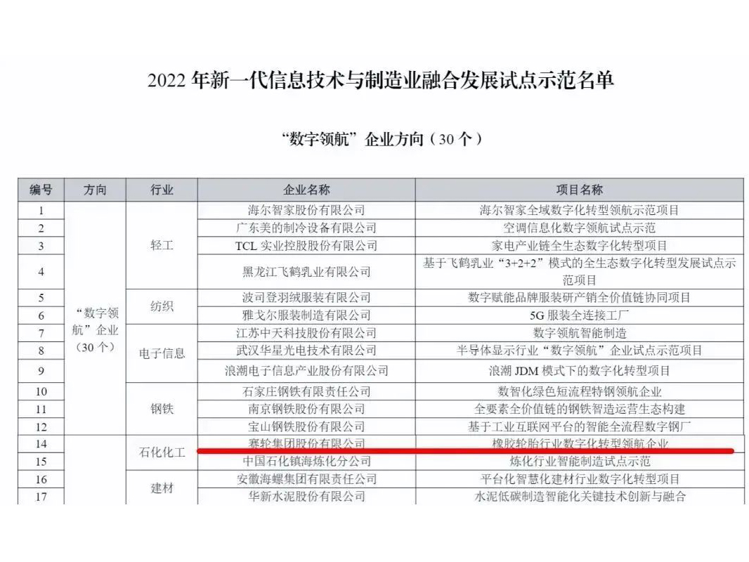 10月31日,工業(yè)和信息化部網(wǎng)站公示了2022年新一代信息技術(shù)與制造業(yè)融合發(fā)展試點示范名單,在本次試點示范中,工信部首次提出了“數(shù)字領(lǐng)航”企業(yè)方向。本次公布的首批30家數(shù)字領(lǐng)航企業(yè)中,賽輪集團是橡膠輪胎行業(yè)唯一入圍企業(yè)。